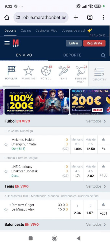 Regístrate y activa un bono de bienvenida que puede llegar hasta 200 € con el código promocional Marathonbet HISPFREE . Atrévete a disfrutar de una auténtica maratón de oportunidades en Marathonbet España.